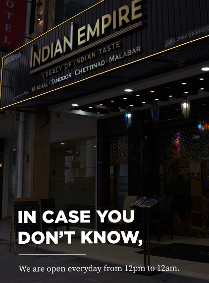Established in 2018, Indian Empire Restaurant was founded with a passion to bring the rich, vibrant, and diverse flavours of India to the heart of Kuala Lumpur. Nestled in Bukit Bintang, we are proud to serve authentic North and South Indian cuisine in a setting that combines traditional warmth with modern elegance. From classic biryanis and creamy curries to tandoori grills and regional specialties, our menu is a tribute to the culinary heritage of India. Every dish is prepared with carefully selected spices, fresh ingredients, and the expertise of skilled chefs who honour traditional recipes.